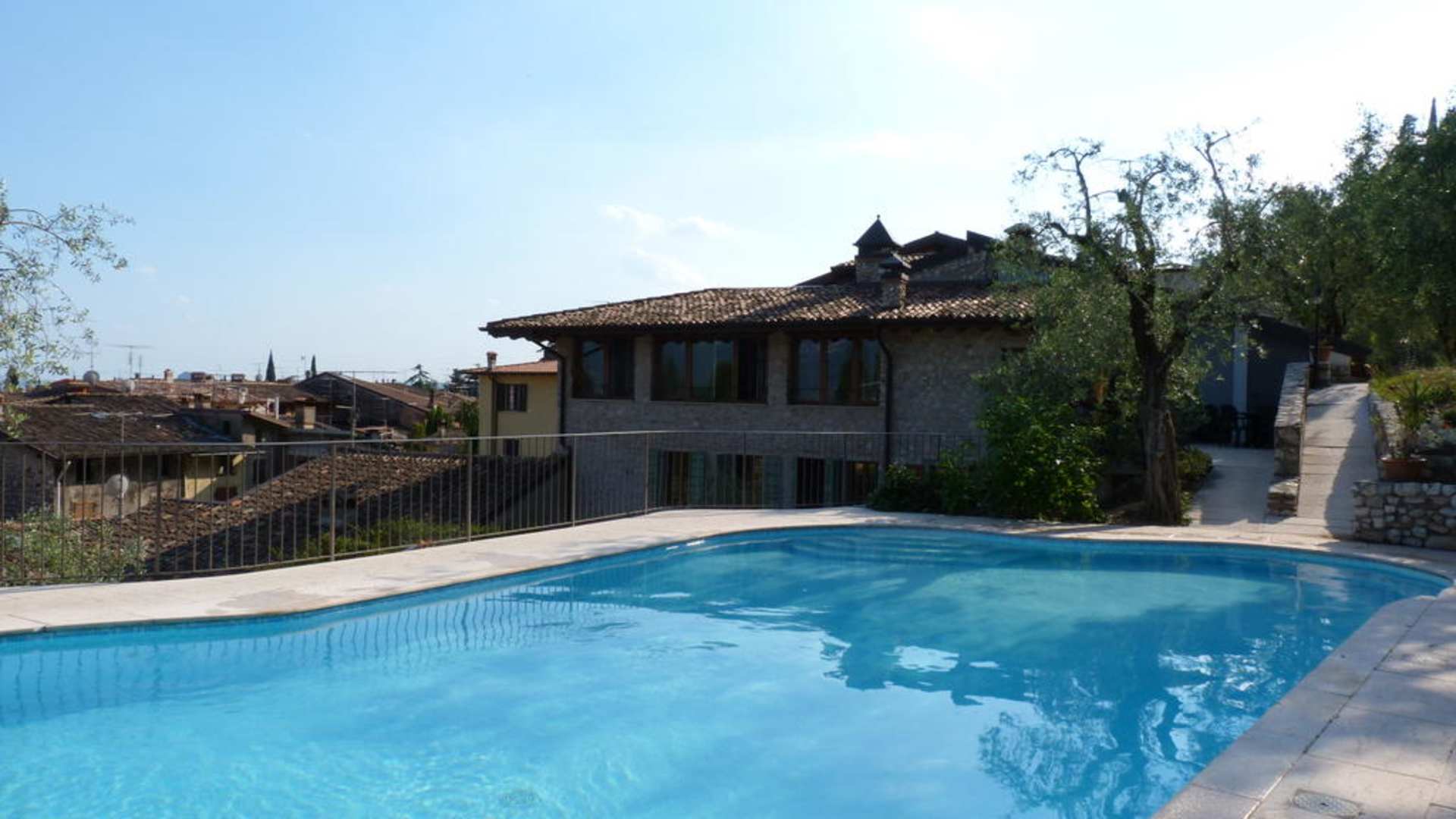 Blick vom Pool auf die Fensterreihe der obersten 2-Zimmer-Wohnung.