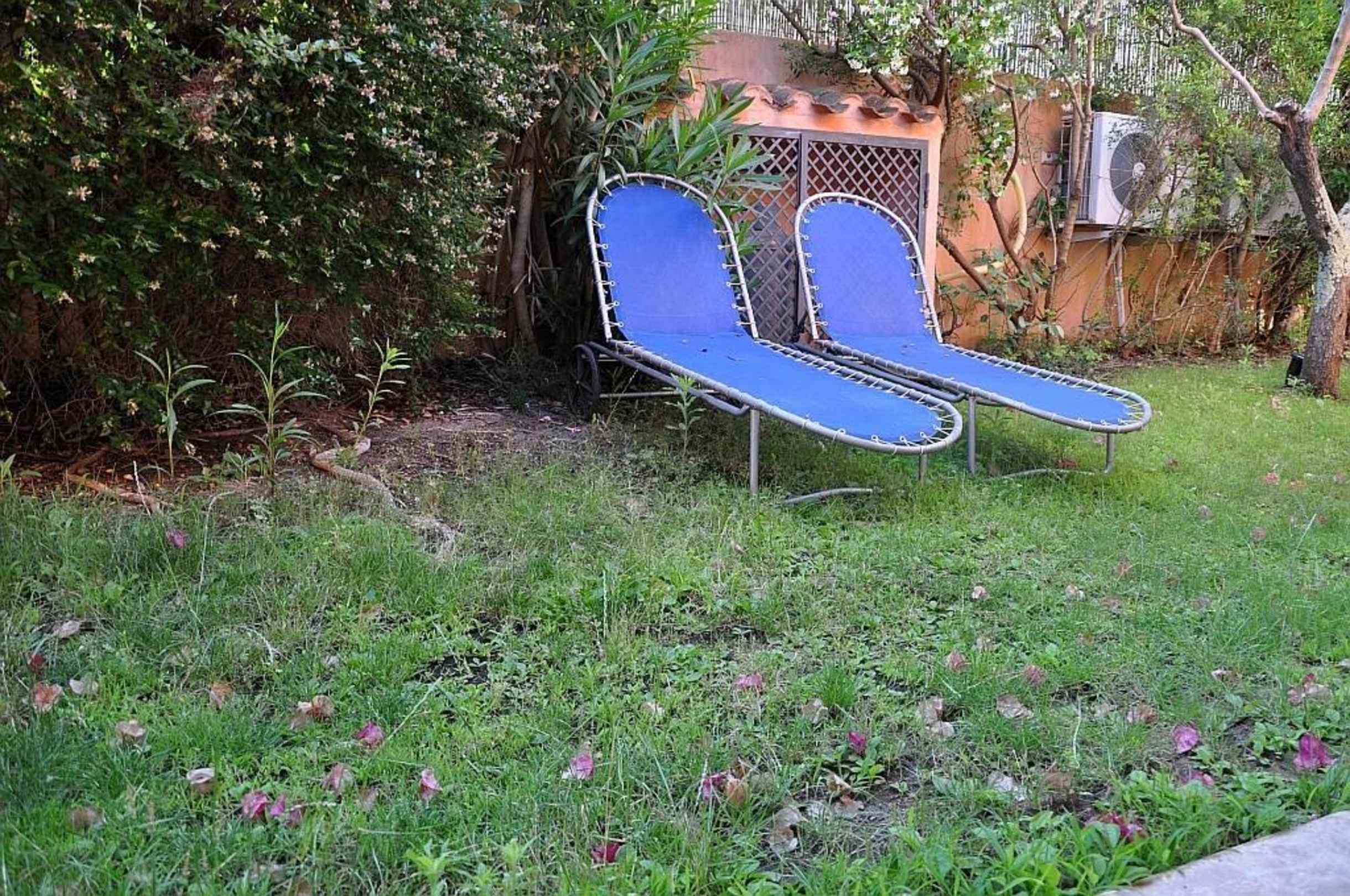 Ausblick auf Garten mit Liegestühlen