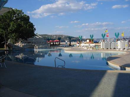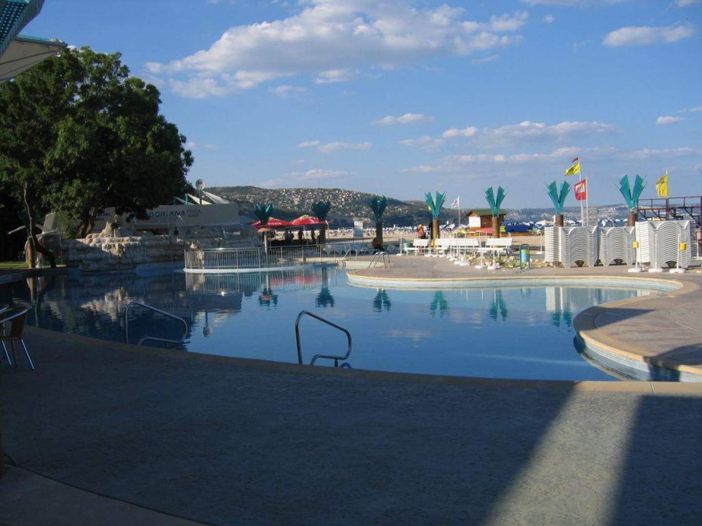 Blick vom Hotel über den Pool zum Strand.