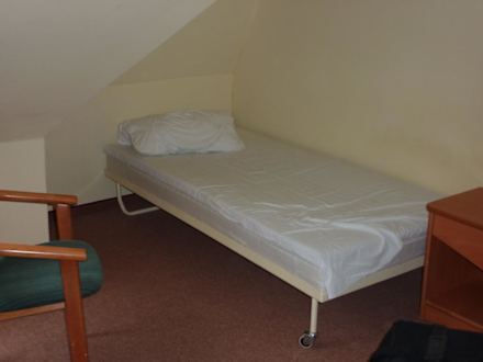 Ein Bett von dreien, die im Zimmer waren