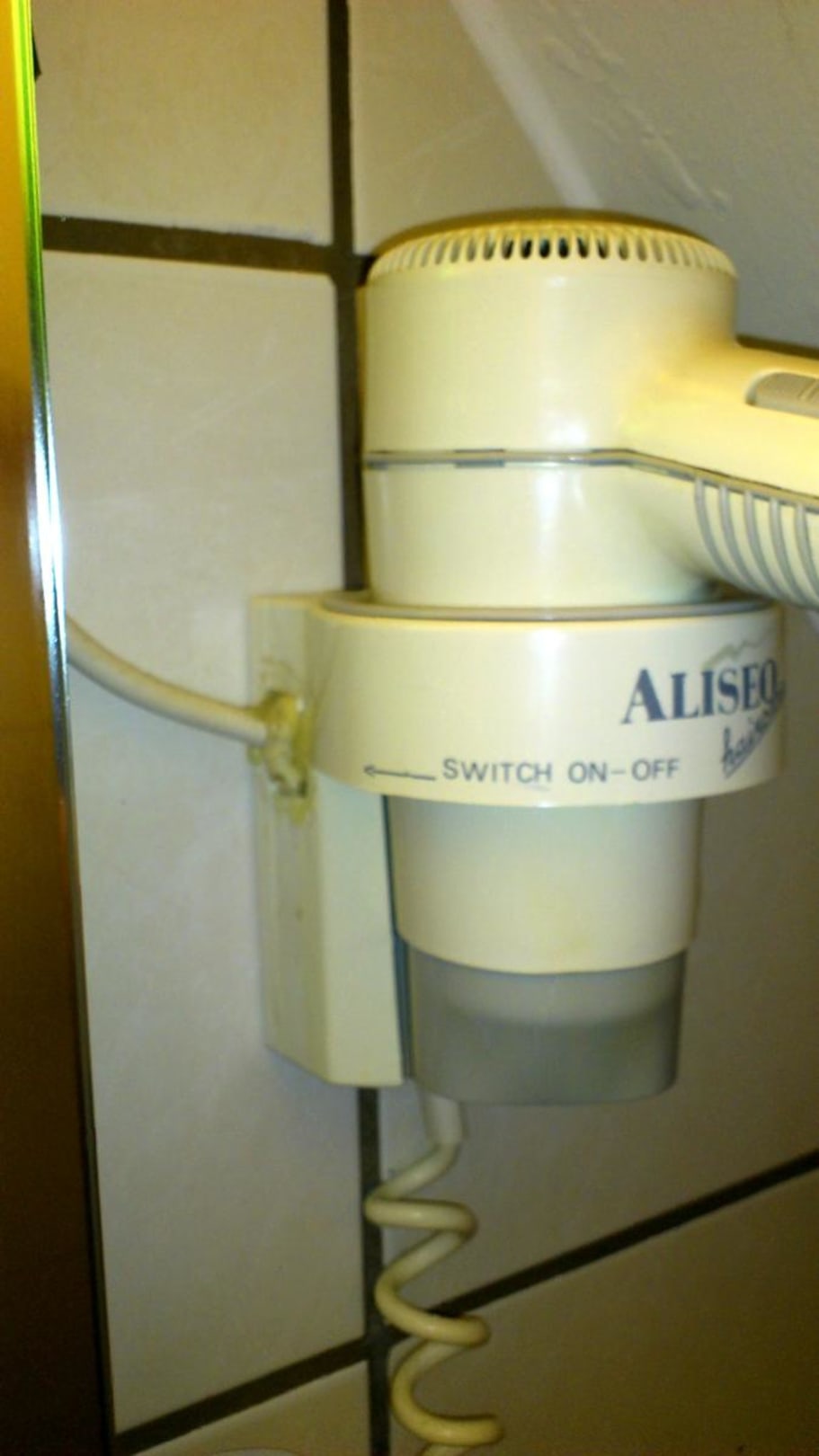 Zimmer Nr. 13 - Fön neben dem SpiegelDer Fön bzw. die Stromzuleitung wurde mit Heißkleber "repariert".