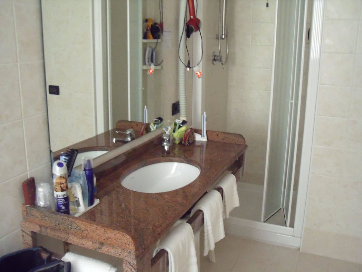 Das Bad im Standardzimmer mit seitlichem Meerblick; Dusche und sehr schöne Waschbecken, mit großer Ablagefläche.