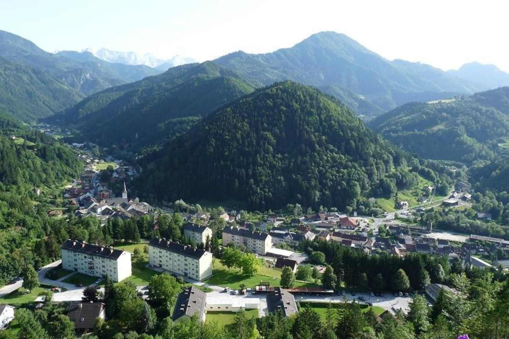 Blick vom Balkon unseres Zimmers auf den Ort Bad Eisenkappel und Umgebung