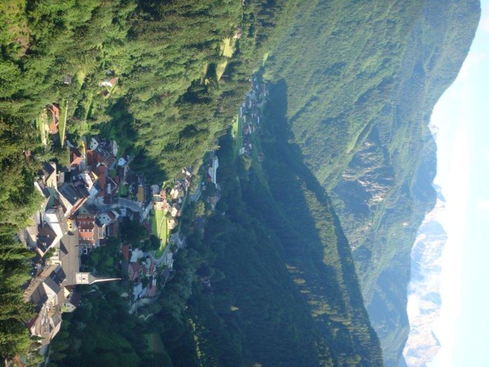 Vom Hotelbalkon und vom Speiseraum aus hat man einen wunderschönen Blick hinunter in den Ort Bad Eisenkappel und auf die Karawankenberge.