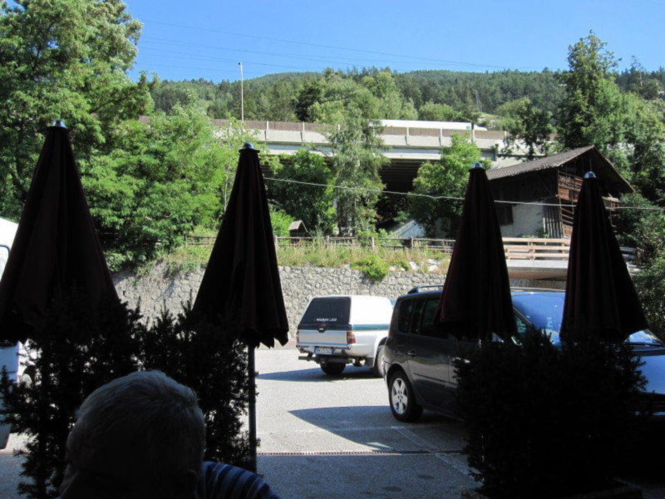 Blick von den Außentischen auf Autobahnbergwelt