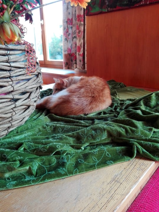 Katze zwischen den Tischen beim Fenster
