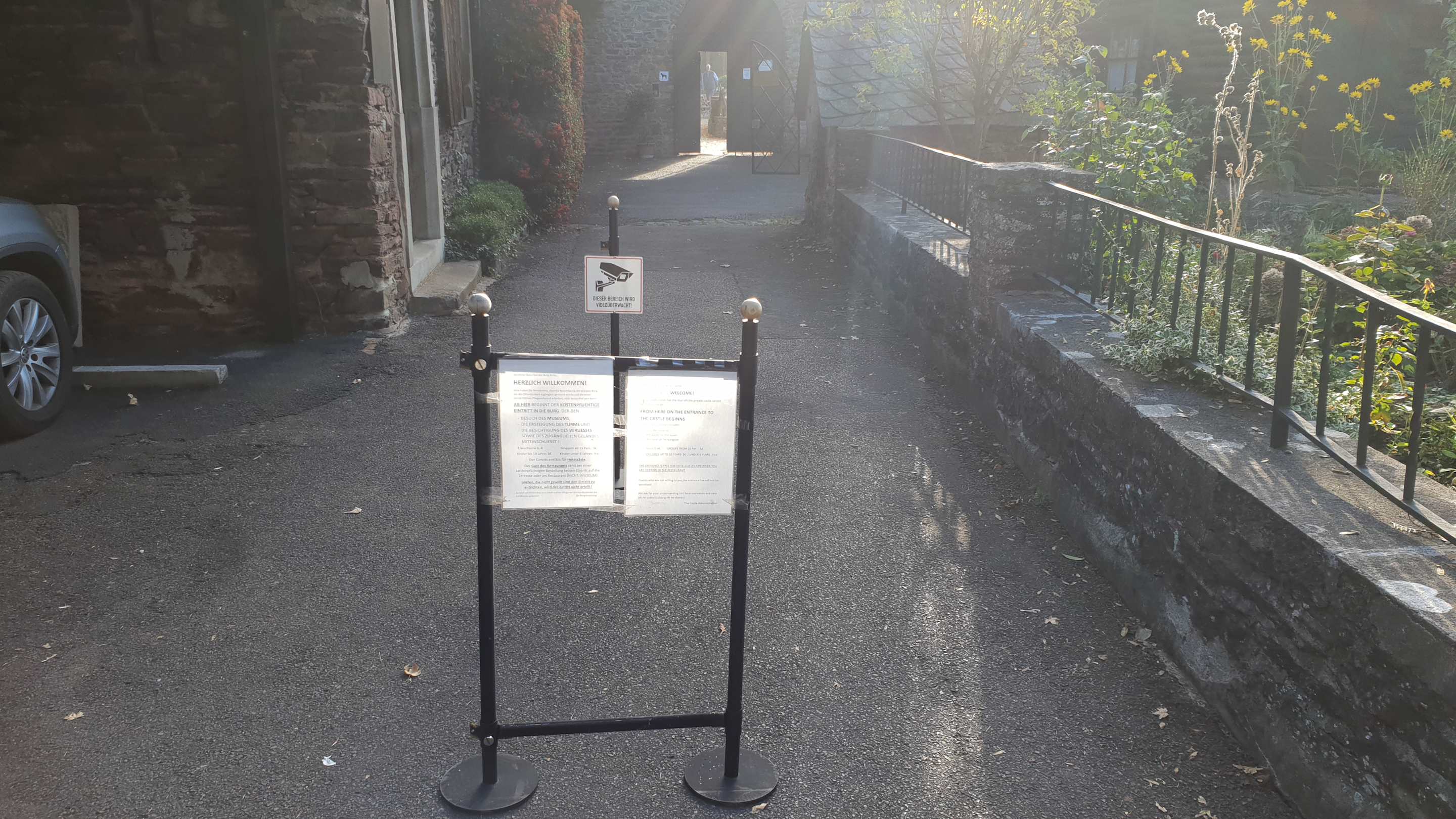 Direkt am Eingang wird schon vor der Videoüberwachung gewarnt und davor hängen die Höhe der Kosten, die eingetrieben werden, bei Überschreitung der Demarkationslinie - gekennzeichnet durch den Ständer.