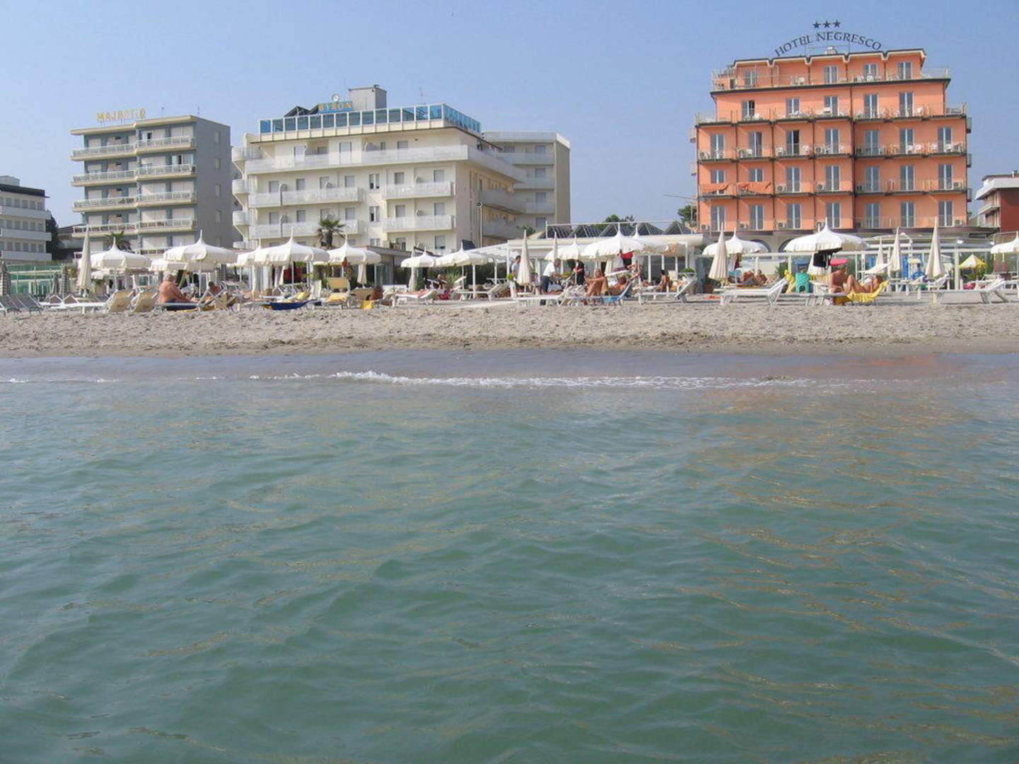 In der Mitte des Bildes ist das Hotel mit Strand vom Meer aus gesehen.
