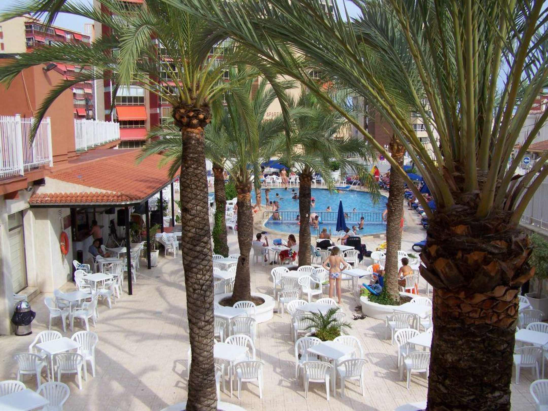 Das ist der Hotelpool mit Palmen und den Tischen, Stühlen und im Hintergrund die Liegen.