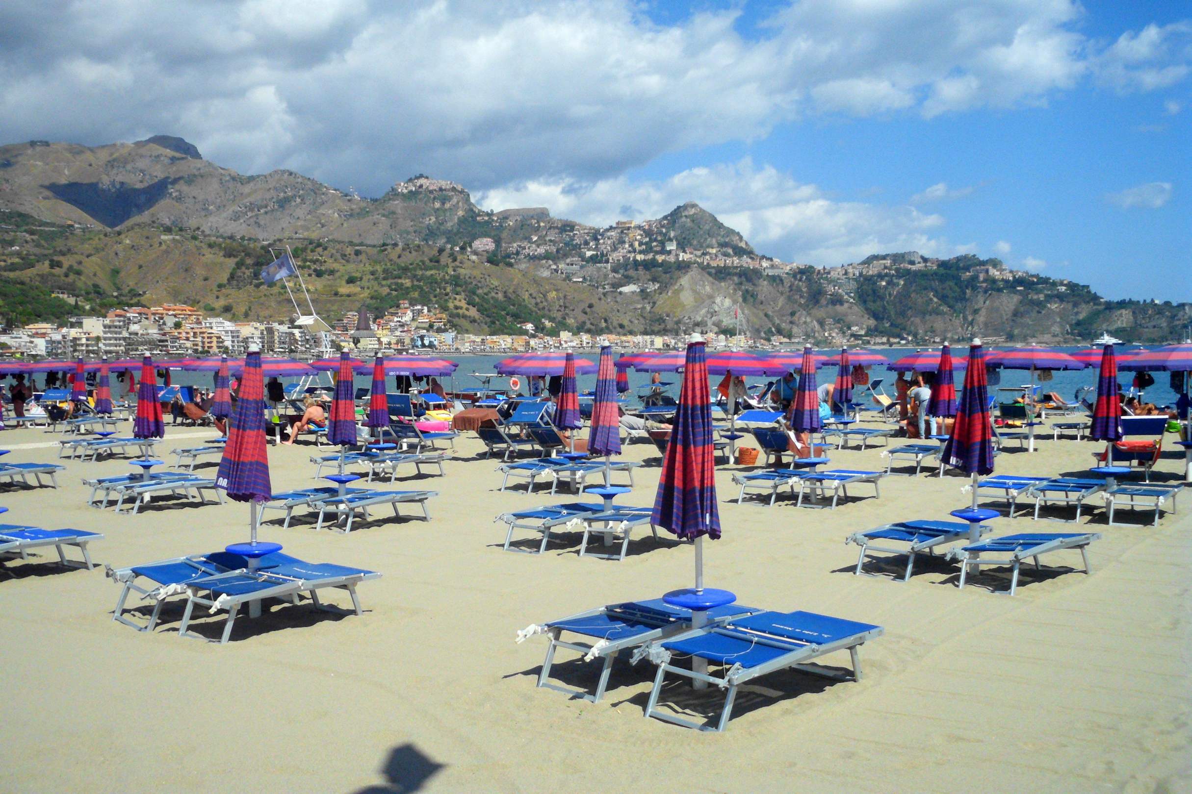 Die hier zu sehenden Liegen und Sonnenschirme kosten 5,-- € pro Stück und Tag. Für Gäste des Hotels sind sie jedoch kostenlos.