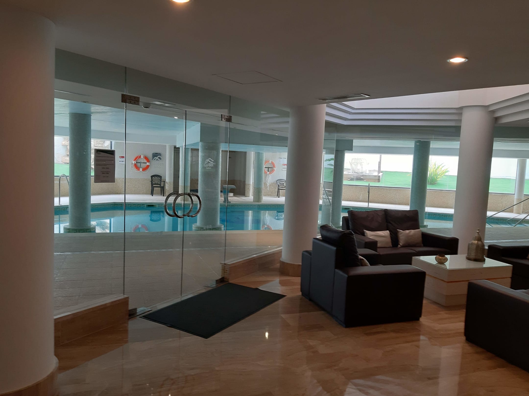 Poolanlage innen. Es gibt auch einen Whirlpool. Dieser ist leider nicht gut zu erkennen.