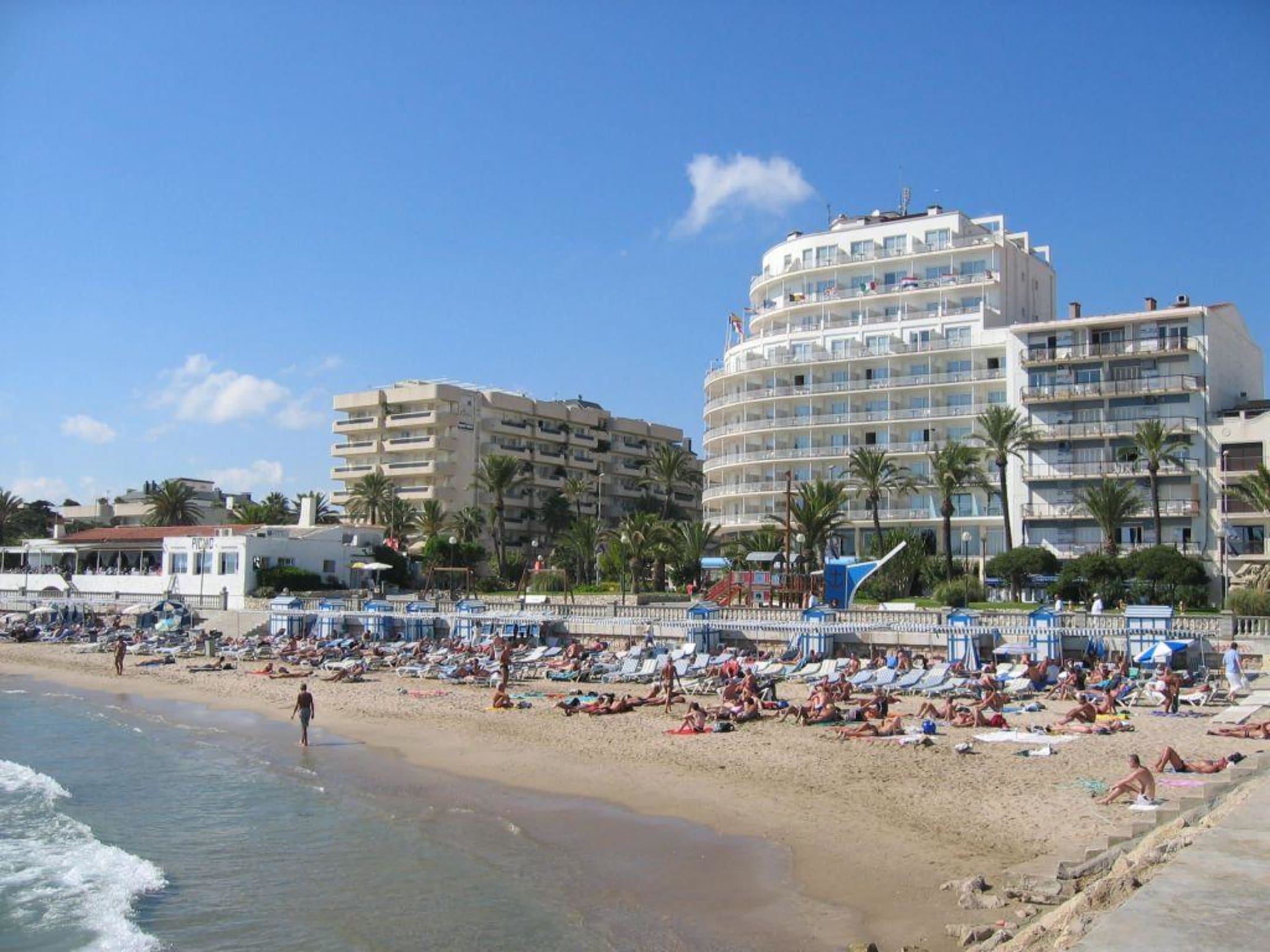 Hotel Calipolis, Toplage direkt an der Strandpromenade von SDas " Calipolis" liegt direkt an der Promenade, nur einen Steinwurf von schmalen, langen Sandstrand in Sitges entfernt. Der Strand ist im Sommer absolut überfüllt, Liegen und Schirme sind super-teuer! Achtung: