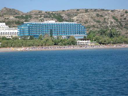 Ansicht vom Meer aus auf das Hotel Hotel Calypso Beach in Rhodos