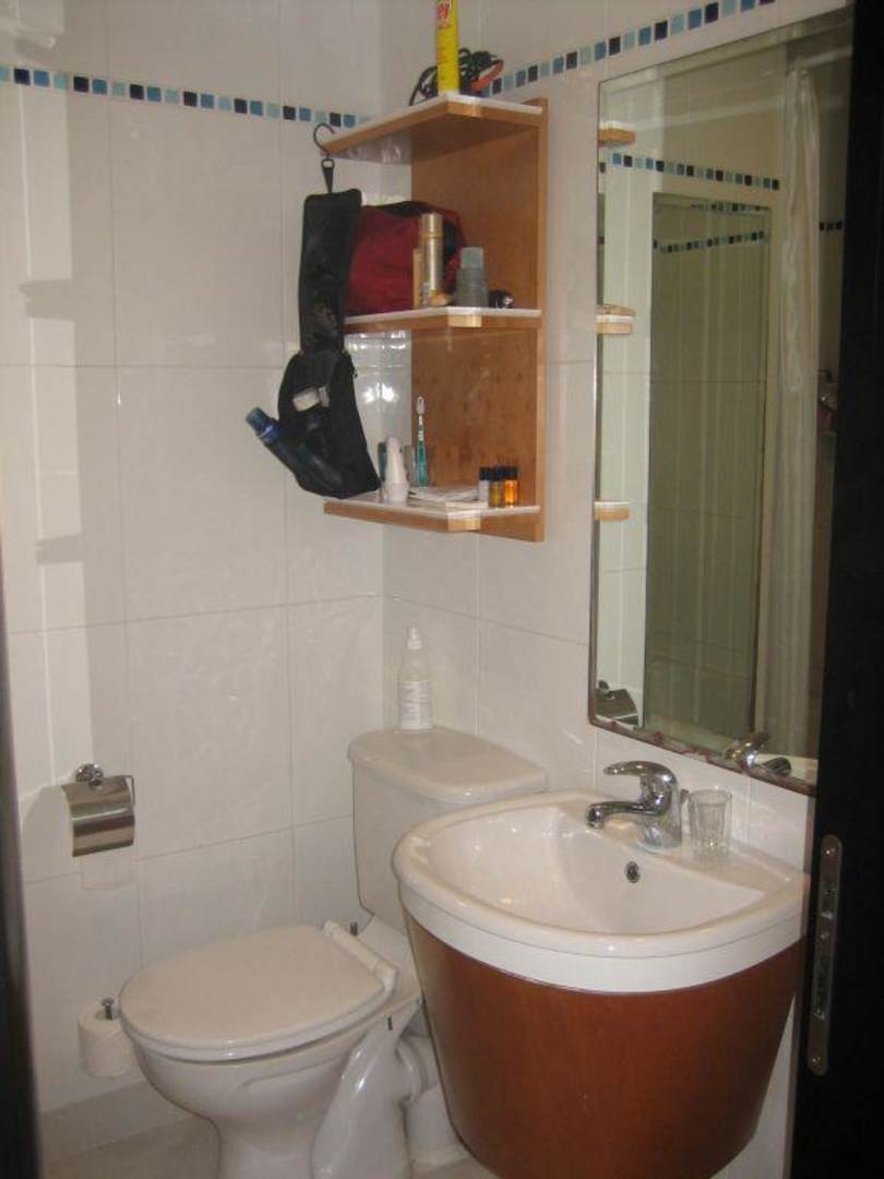 Blick ins Bad. Die Badewanne mit Duscharmatur befindet sich hinter der Tür.