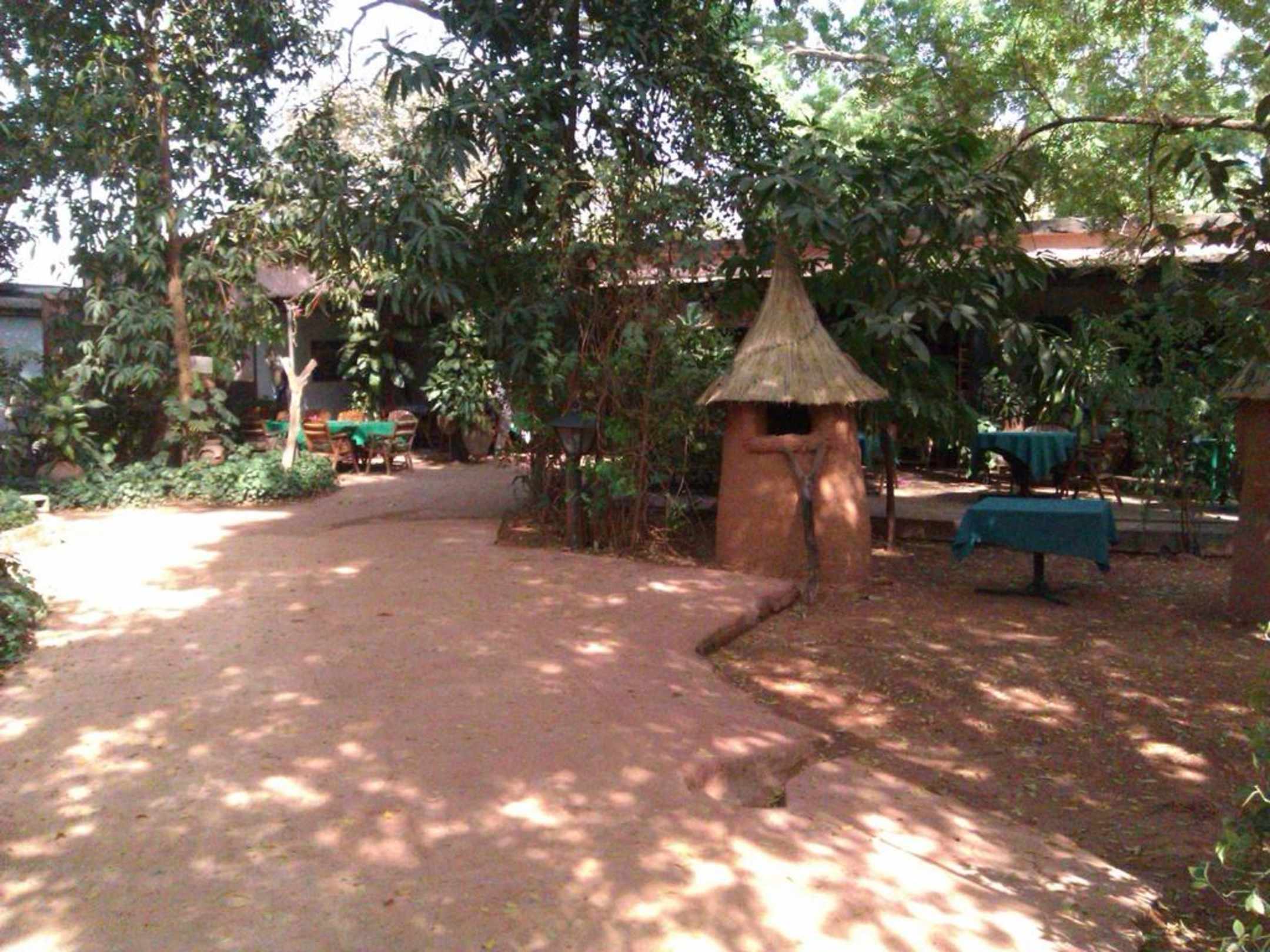 Garten mit Blick auf das Restaurant