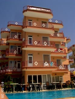 Auf diesem Bild sieht man ein Gebäude (von zweien) des Hotels Canside ex Canlar Kapadokia. Es ist ein schön-gelegenes Hotel in Side.