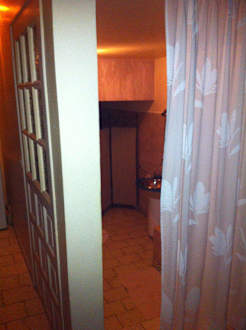 Badbereich durch Vorhang (Achtung: dahinter zwei Stufen) vom Zimmer getrennt