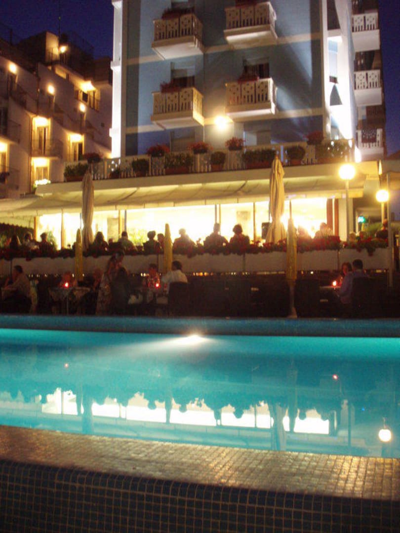 Pool und Hotel bei Nacht