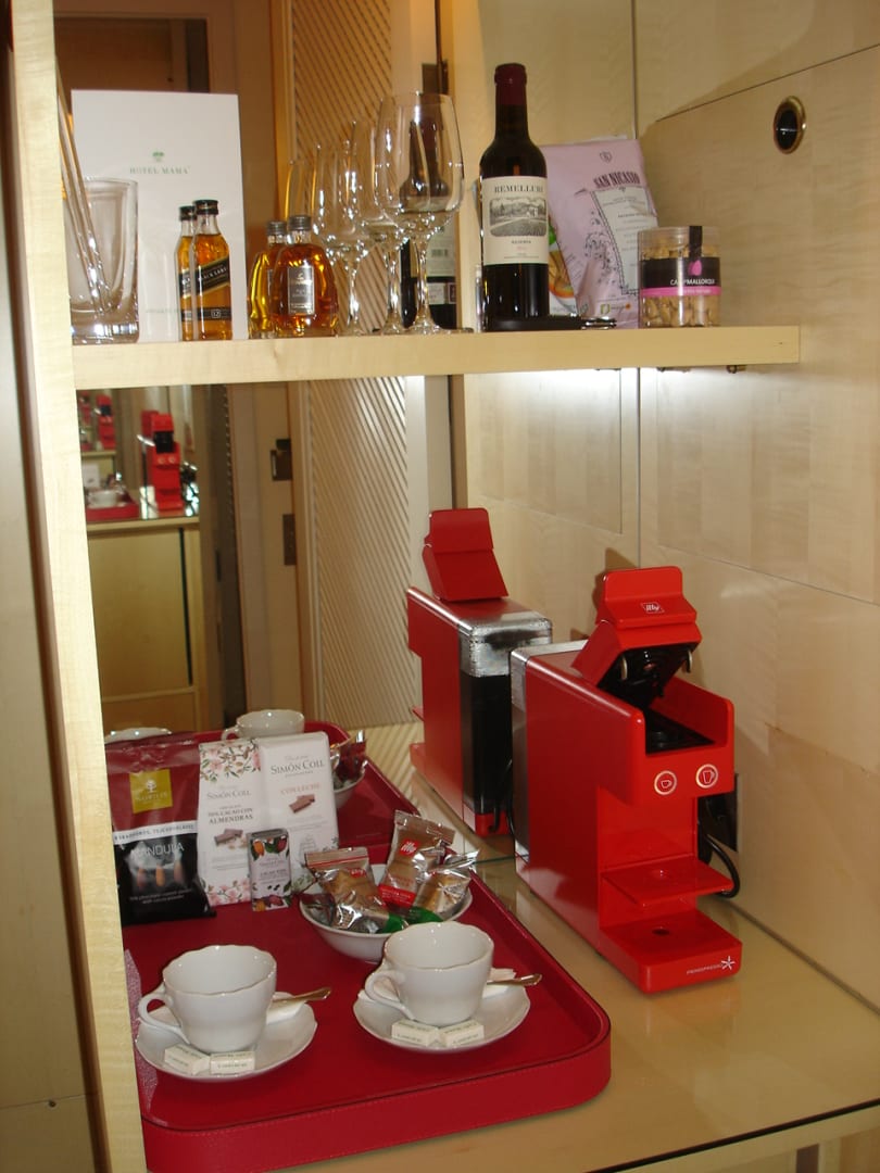 Teilansicht der Minibar sowie Kapsel-Kaffeemaschine mit grat