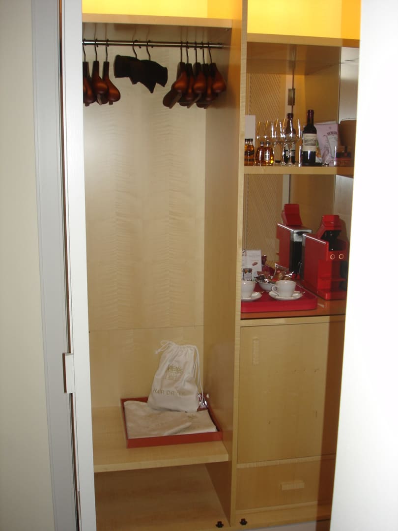 ZimmerDer eher kleine Kleiderschrank (dafür gab es in einer Kommodo massenhaft Ablageplätze) mit Minibar und Kaffeemaschine