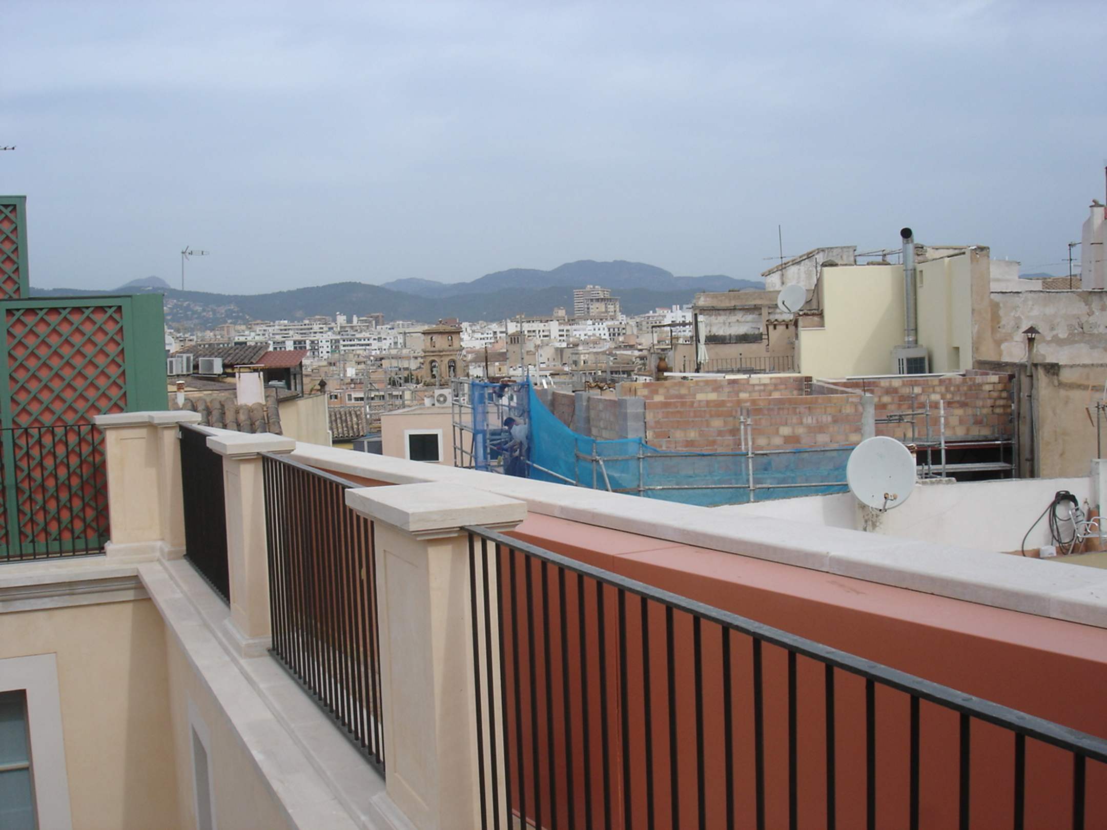 Ausblick von der Dachterrasse über die Stadt zu den Bergen