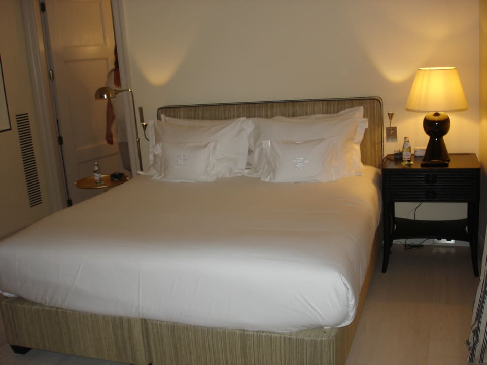 Doppelbett im Zimmer.Merkwürdigerweise gibt es nur rechts einen vollwertigen Nachttisch, links steht ein eher provisorisch wirkender Tisch