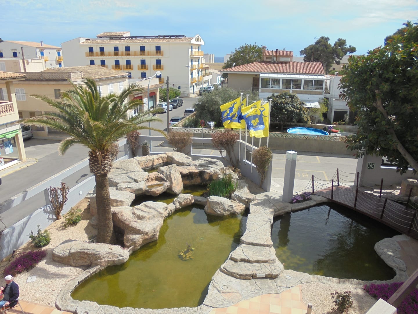 Gartenanlage mit 2 kleinen Teichen, einzelnen kleinen Fischen unmittelbar am Eingangsbereich; daneben ist eine Bank und separat davon Stühle und Tische für Raucher