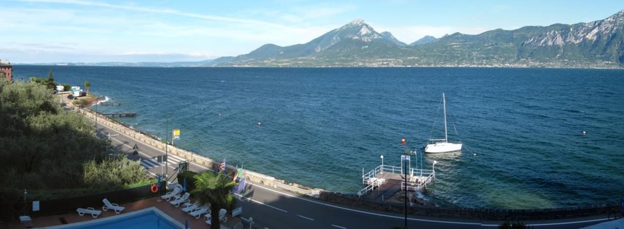 Blick vom BalkonPool, Hotelstrand mit Hotelsteg, süd-westliche Gardaseeberge und Petunien auf dem Balkon :-)