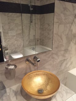 Spiegel und goldenes Lavabo in Badezimmer