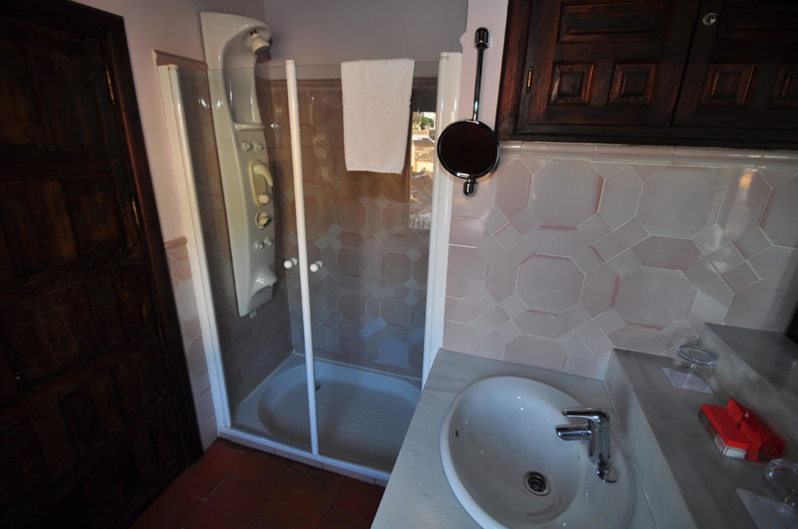 In der Dusche ist eine Art Massagesystem installiert, das schon etwas antiquiert wirkt. Ansonsten hat man auch hier die gleiche traumhafte Aussicht...