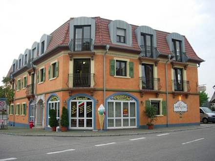 Das Casa Rustica liegt an der Hauptstrasse in Rust und ist aufgrund der Farbe nicht zu übersehen. Unten ist eine Pizzeria und Eisdiele. Die Kugel kostete 70 cent.