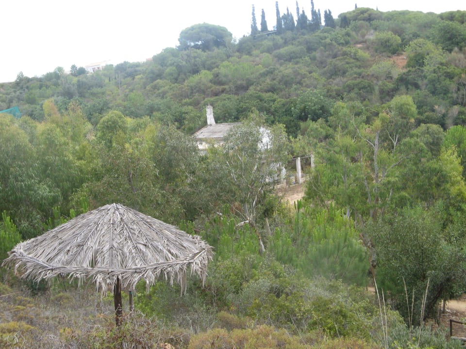 An mehreren Stellen im Garten befinden sich solche Schattenspender. Meist ist neben einem dieser "Sonnenschirmen" auch noch eine einfache Holzbank zum Ausruhen aufgestellt.