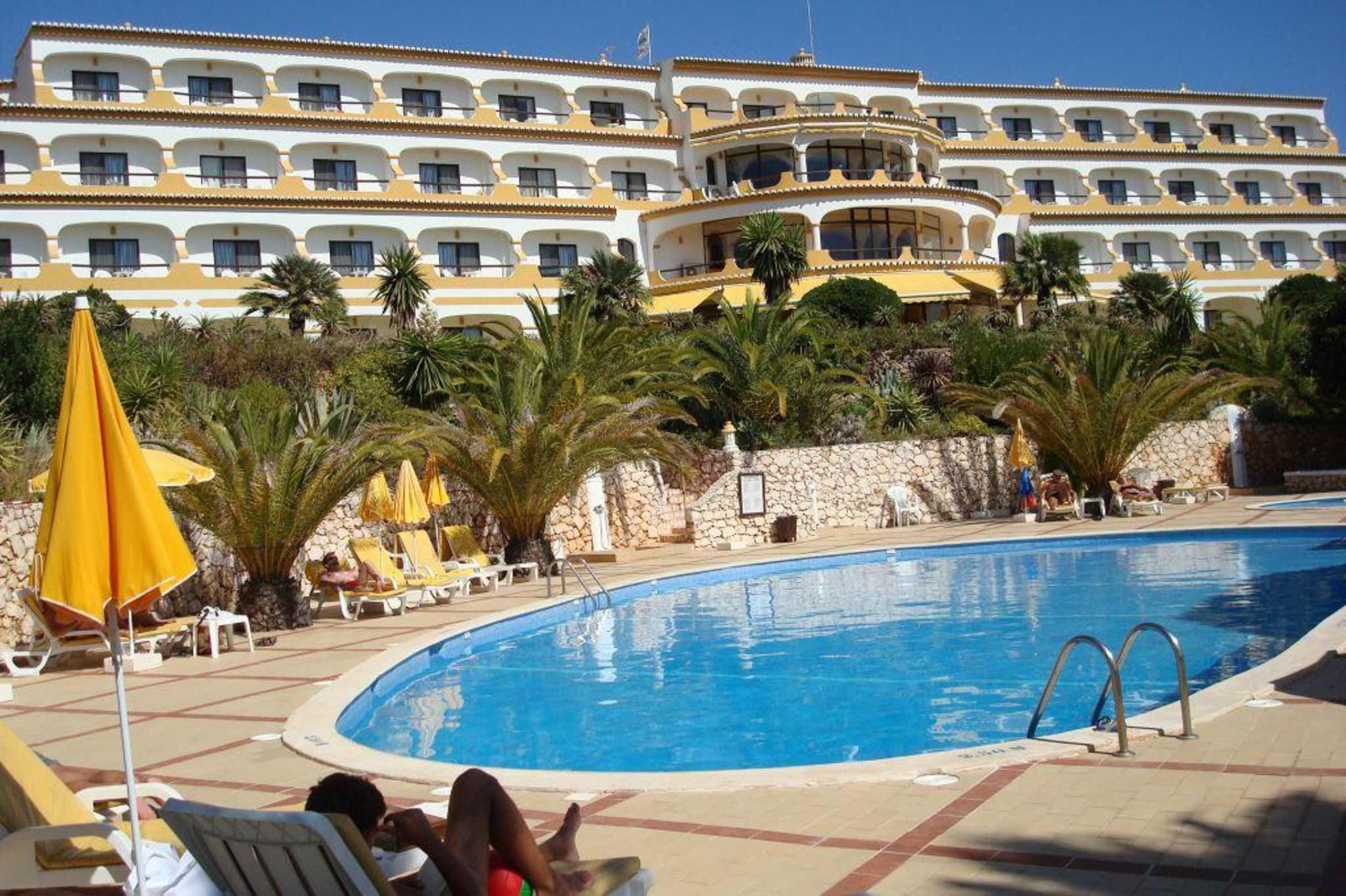 Blick vom Poolbereich/Liegewiese auf das Hotel