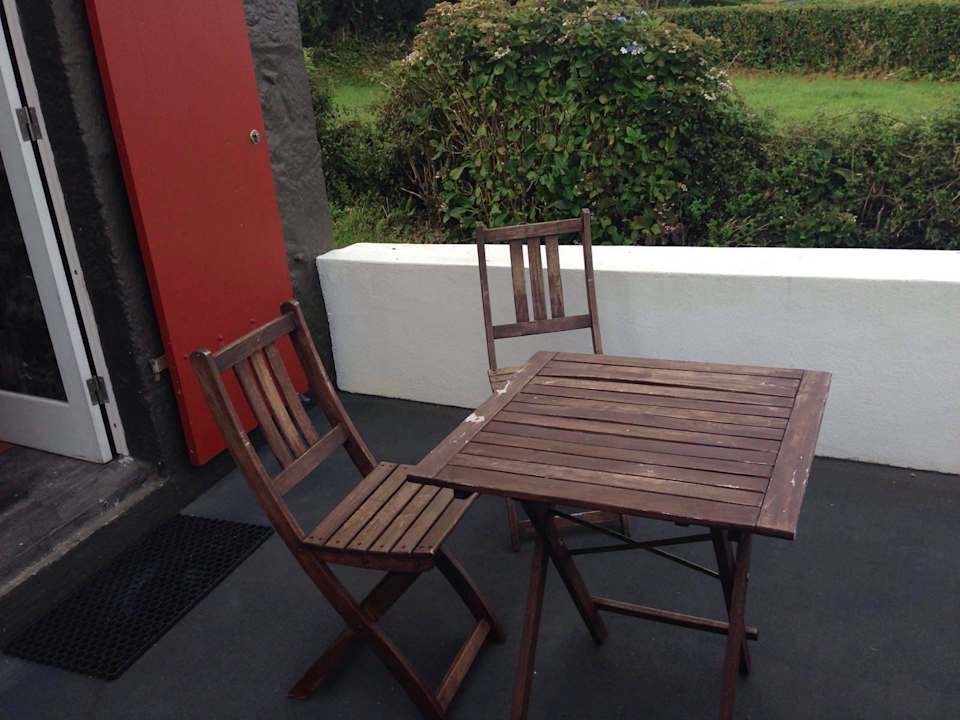 Terrasse, mit wenig schönem AusblickUnsere einfachen Gartenmöbel bestanden aus diesem kleinen Tisch und diesen zwei Stühlen.
