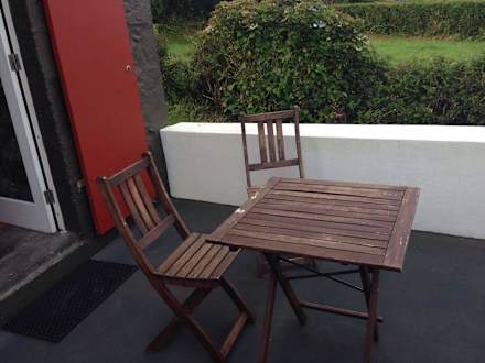 Terrasse, mit wenig schönem AusblickUnsere einfachen Gartenmöbel bestanden aus diesem kleinen Tisch und diesen zwei Stühlen.