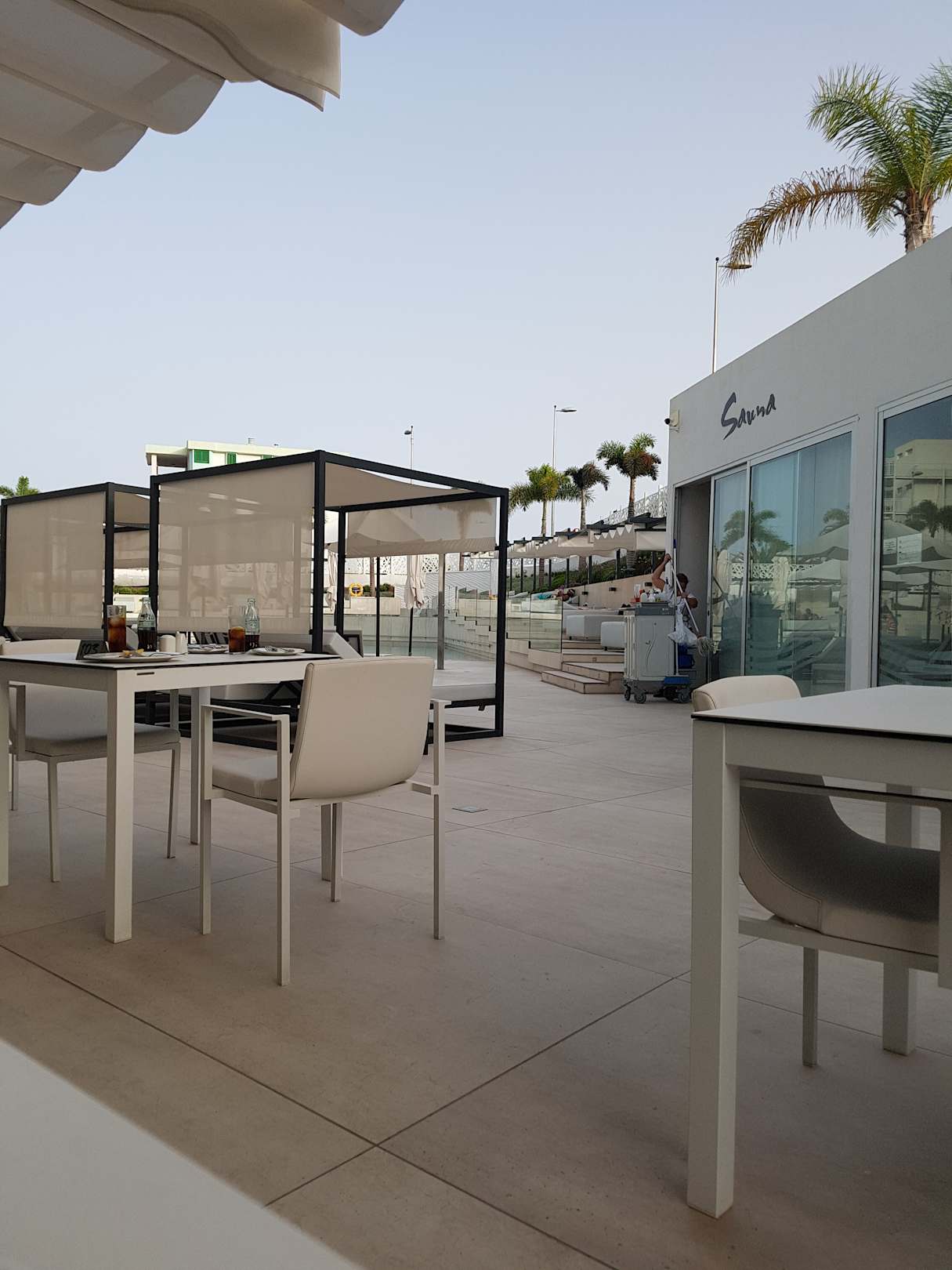 Beim Abendessen Blick auf den Spa Bereich