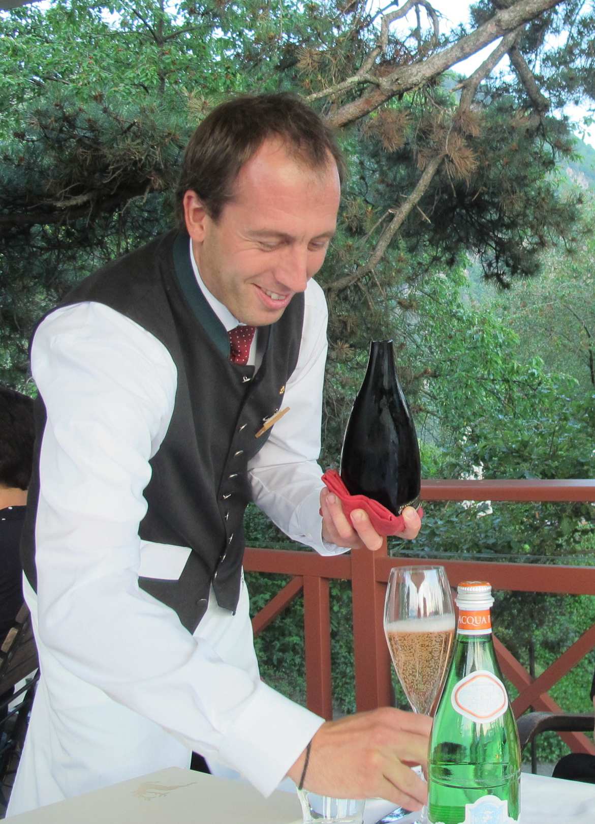 Thomas serviert charmant gesäbelten Champagner