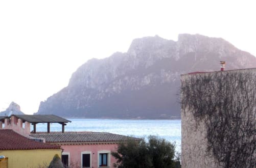 Morgendämmerung; Blick aus dem HotelfensterSchöner Blick auf die Insel Tavolara von Balkon im oberen Stockwerk des Hotels.