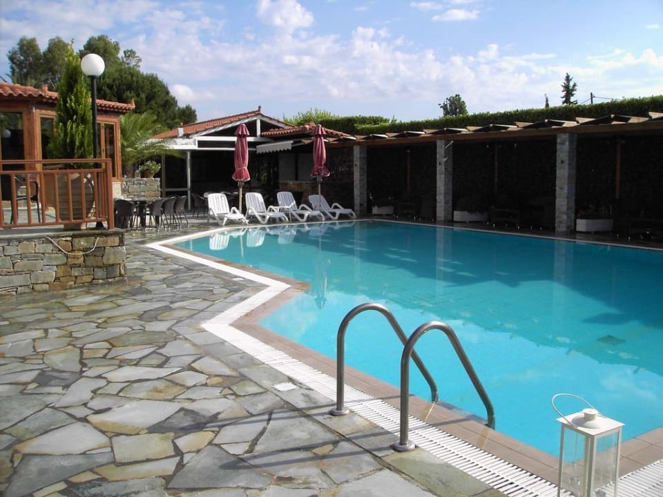 Pool mit überdachter Sitzgelegenheit, im Hintergrund eine Außenbar, an der man auch tagsüber, bis in die späten Abendstunden Getränke bestellen kann.
