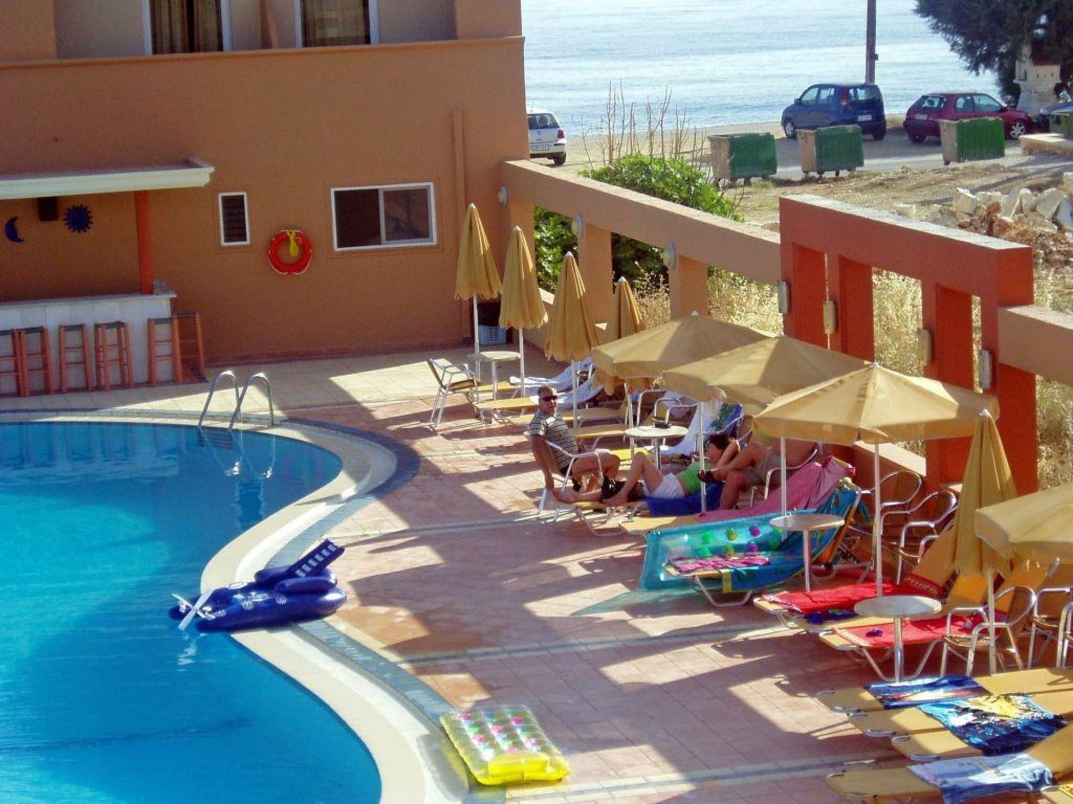 widok z pokoju na basen po prawej za murem ,legowisko szczurow