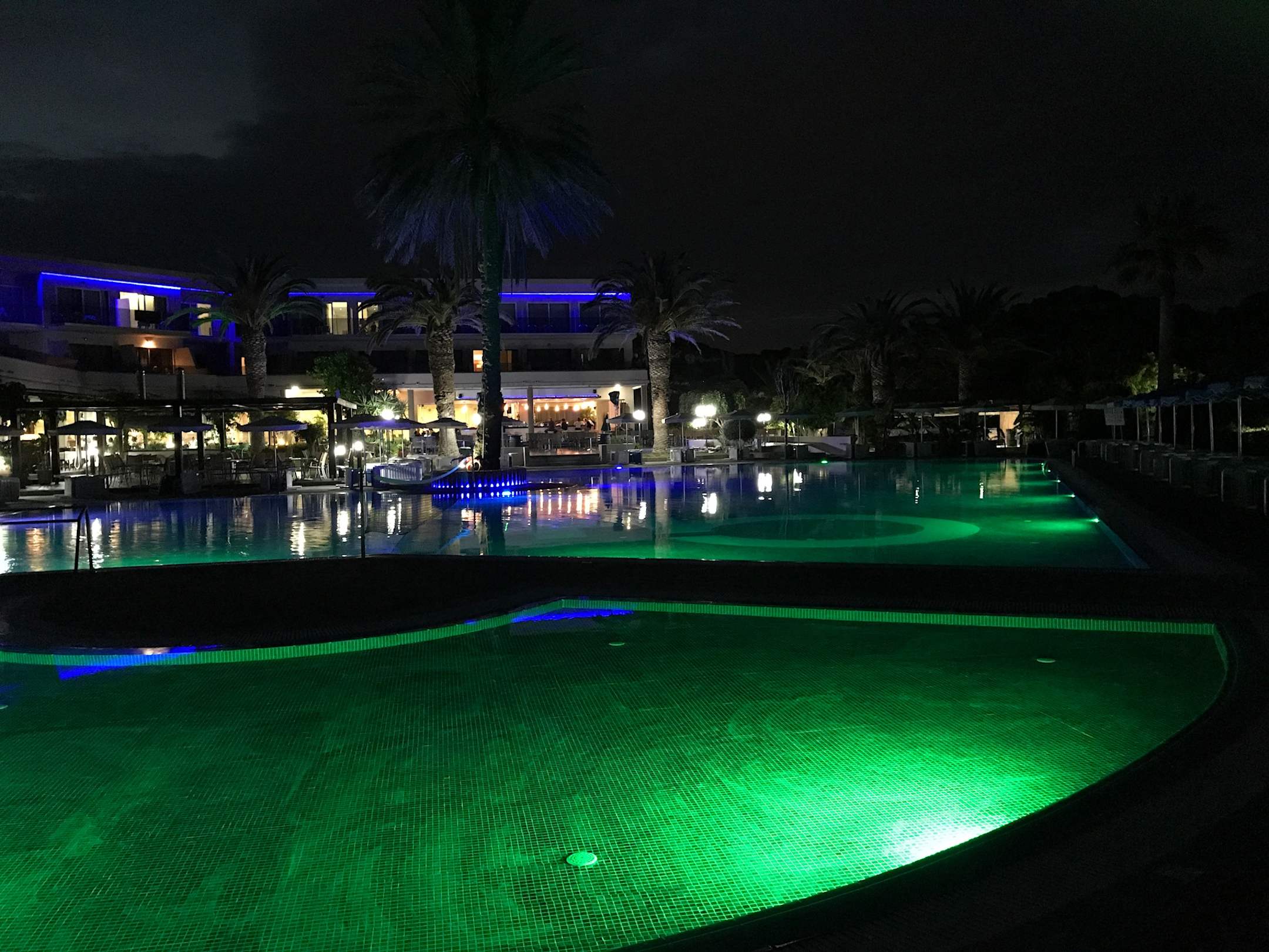 Poolanlage bei Nacht.