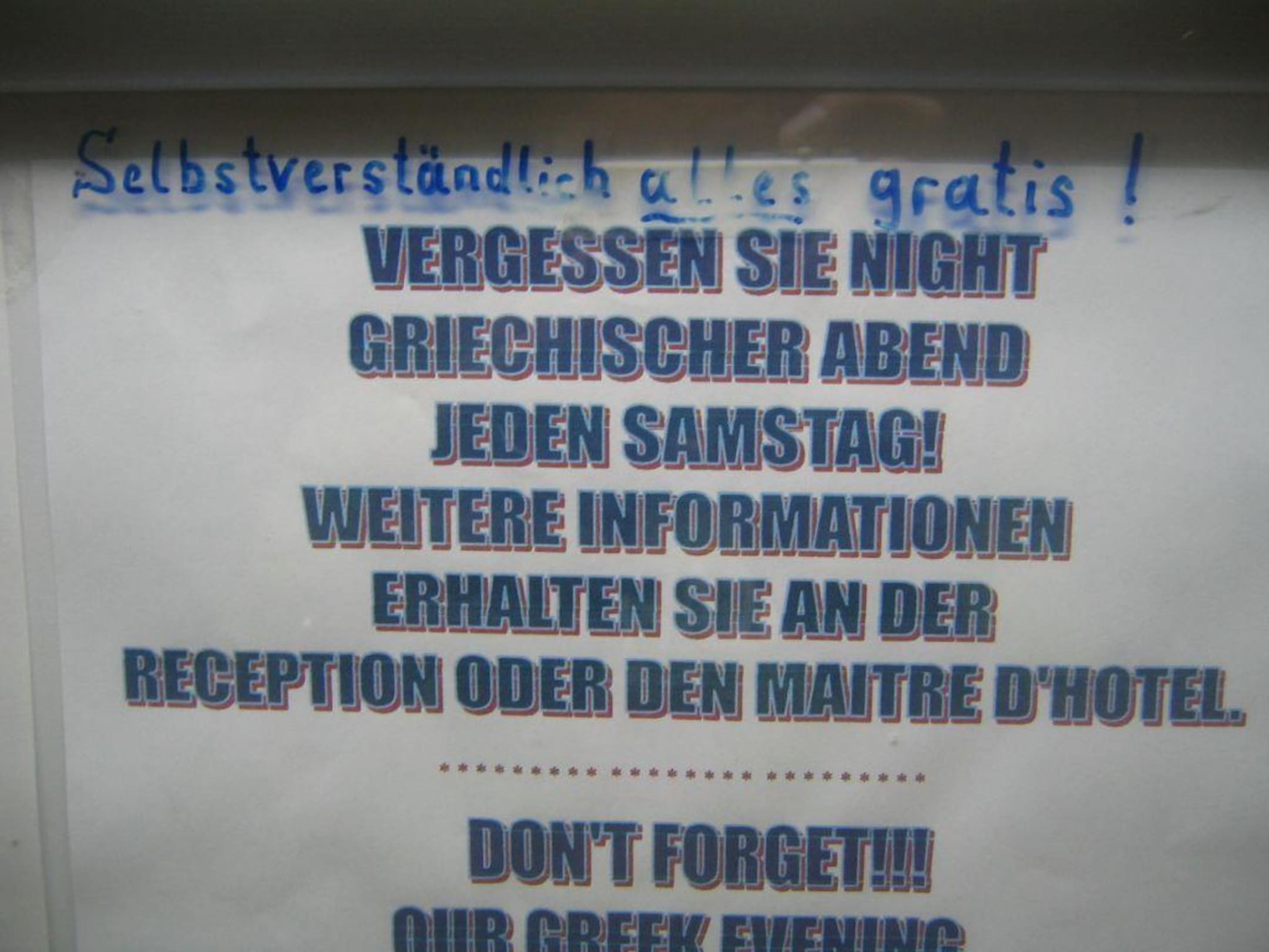 Hotelfahrstuhlda hat sich jemand über den griechischen abend lustig gemacht. war wohl schon länger beschriftet