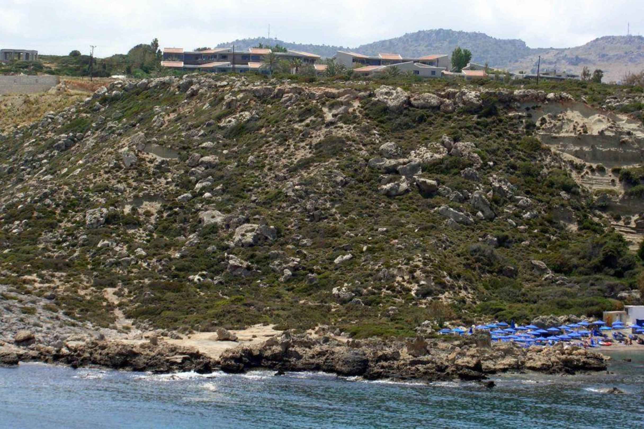 Blick auf das Hotel Cathrin von der Ladiko-/Antony-Quinn-Bay