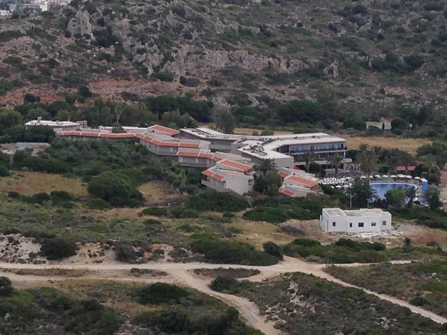 Ausblick auf das Hotel von einer nahegelegenen felsigen Erhebung aus.
