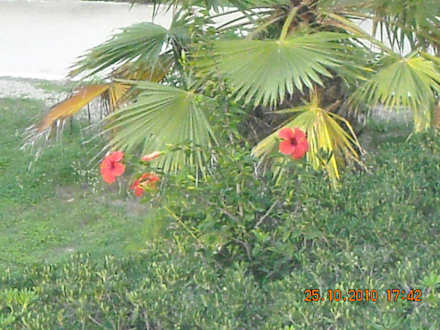 Blick aufs Meer mit Palmen und Blumen
