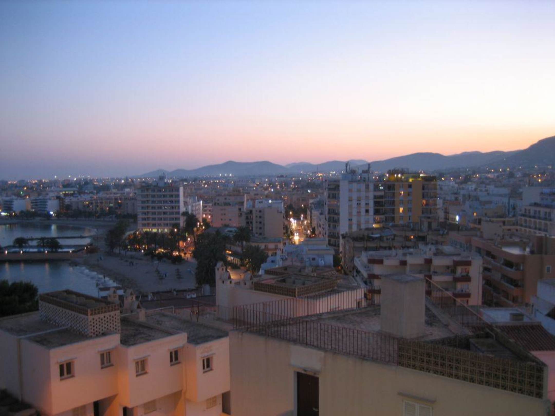 Blick von der Poolbarabends auf Figueretas / Ibiza Stadt (links der kleine Strand vor dem Hotel "Figueretas")