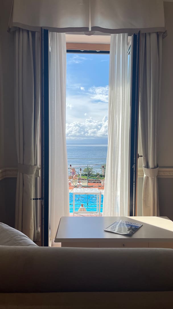 Klassikzimmer mit Meersicht über den Pool sowie kleinem Balkon.