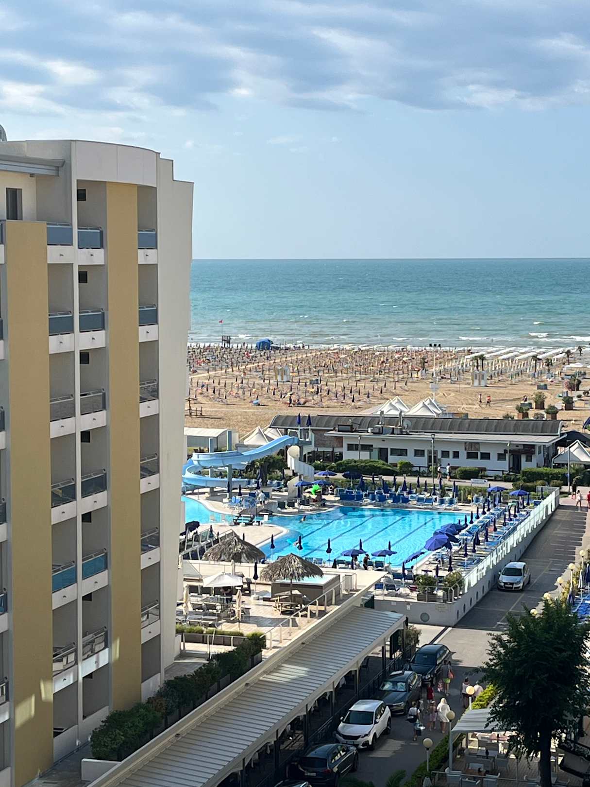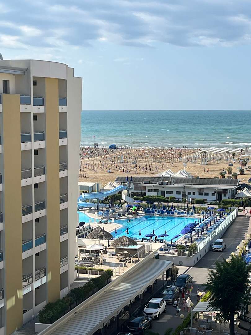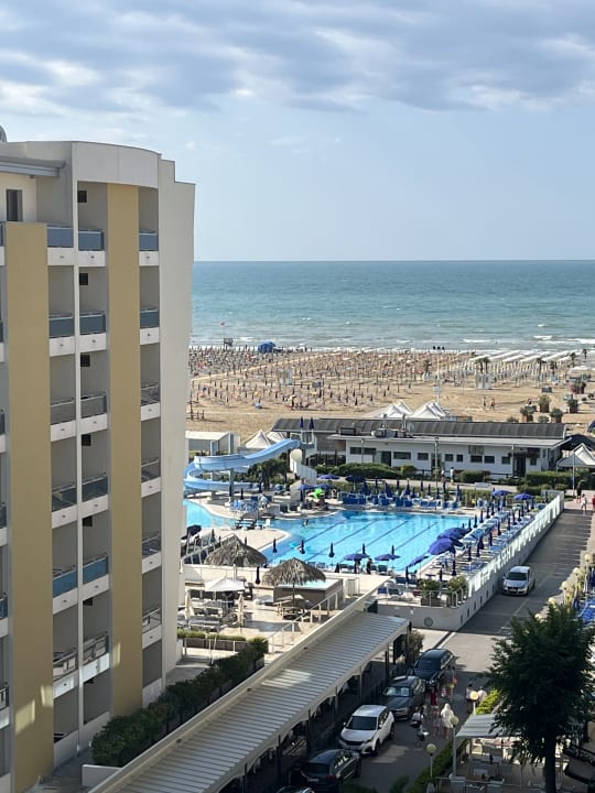 ZimmerBlick vom Balkon, links vorne die Poolanlage des Partnerhotels, die mit genutzt werden kann.