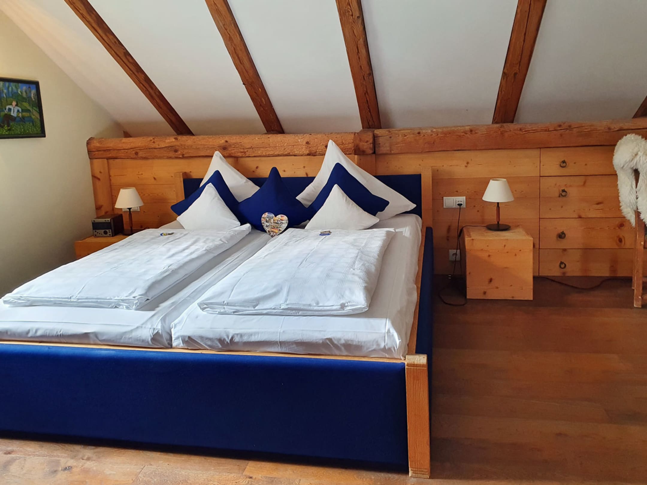 Bequeme Betten im Kräuterzimmer mit Ablage auf den Balken hinter den Betten