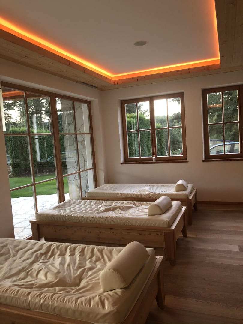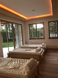Bequeme Wasserbetten und Musik im Ruheraum.